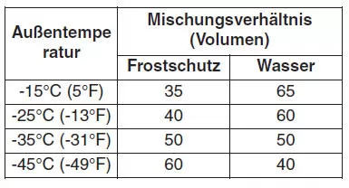 Prüfen Sie die Frostschutzwirkung und die Kühlmittelkonzentration mindestens einmal im Jahr, vorzugsweise vor Winterbeginn und vor Fahrten in kältere Gebiete.
