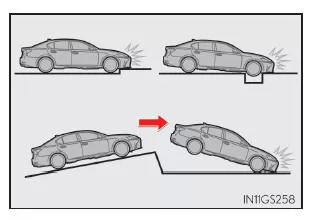 Die SRS-Frontairbags, -Seitenairbags und -Kopf-/Schulterairbags können auch durch einen heftigen Stoß gegen die Unterseite des Fahrzeugs ausgelöst werden. Mögliche Beispiele hierfür sind in der Abbildung aufgeführt.