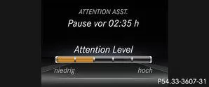 Wenn eine Ermüdung oder zunehmende Unaufmerksamkeit erkannt wird, erscheint im Multifunktionsdisplay eine Warnung: Attention Assist Pause!Zusätzlich zur Meldung im Multifunktionsdisplay hören Sie dann einen Warnton.